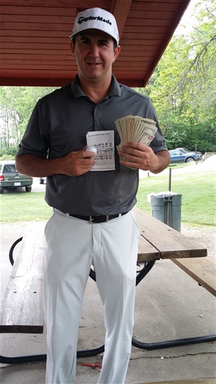 On 5/15/15 I was playing in a big skins game that had carry over from the previous week. I was playing pretty good when I took a disastrous double bogey on #17. So going to the final hole which was playing 152 yard par 3 today. I was debating on club selection because of the steady wind in our face. I went with an 8 iron figuring that short was better than long if the wind pushed it down. I hit the ball and it was straight at the flag. I yelled out get in the hole! The ball hit about two feet in front of the flag and then just fell a little over to the right in the hole. We all celebrated and in which paid me $260.00 worth of skin money. The ironic thing is that my Dad had a hole in one on this same hole some twelve years earlier.