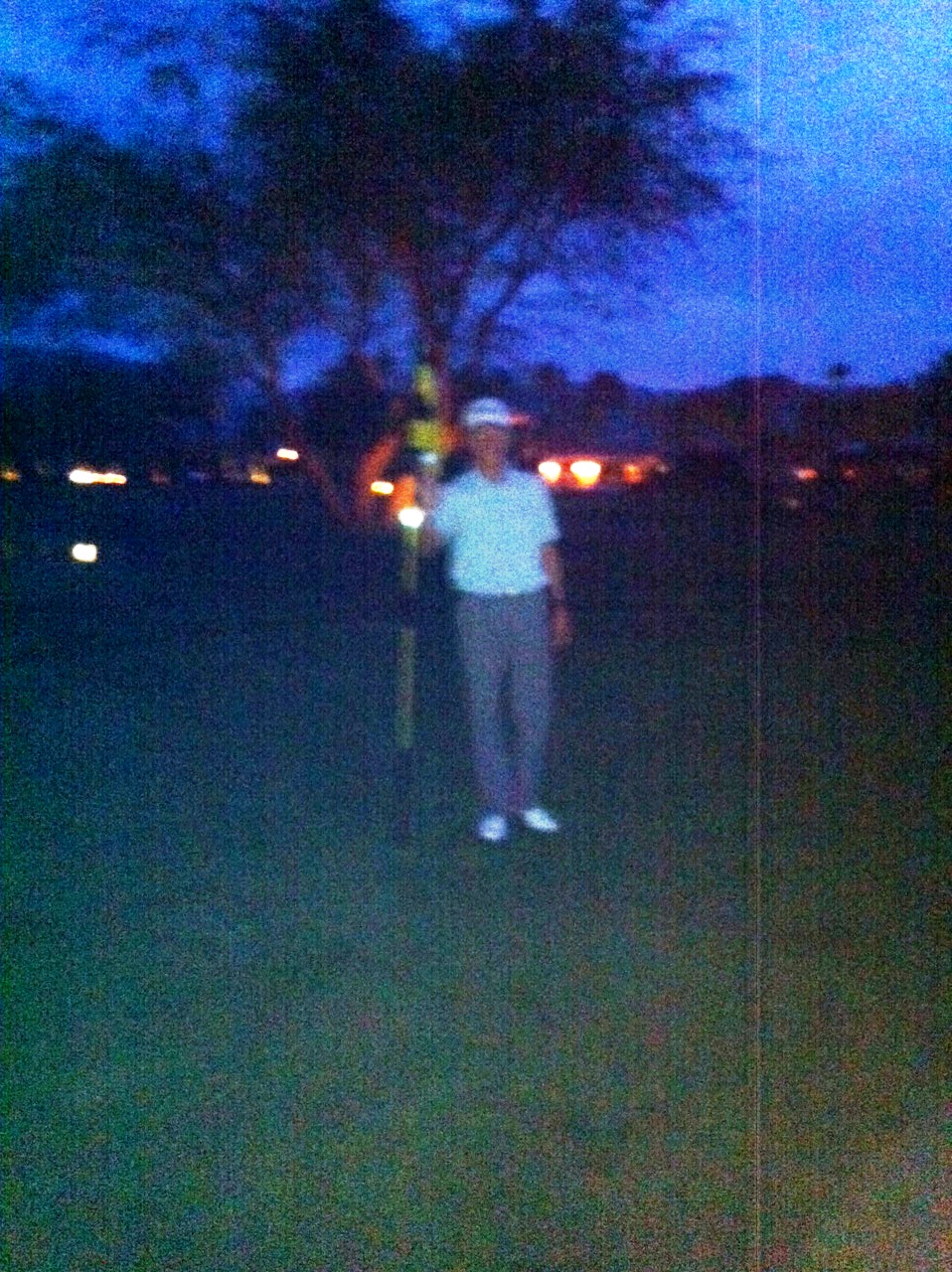 At that time I was at work and received a phone call from Justin he was totally excited telling me he got his second hole in one!! I was busy and congratulated him and quickly got off the phone and got back to work. Around 3 hours later I received another call from Justin this time more excited than the first he said, "Dad I GOT MY SECOND HOLE IN ONE..." I answered, "I know you called me!" He replied, "NO MY SECOND ONE TODAY!!!!!" With a Vokey 56 degree wedge he hit a 90 yard Ace on hole 8 at Motorcoach Country Club in front of his Grandma Linda and his sister. Here is the photo you can see he was running out of light, this happens to him a lot, he isn't easy to get off the course.