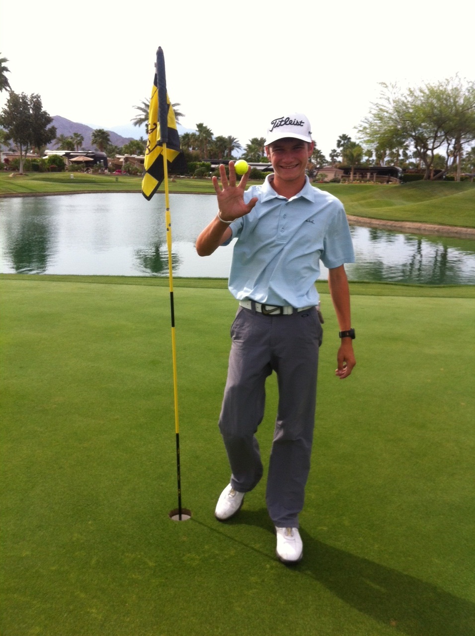 Just a little more than two months later on 3/29/13 golfing with his sister, Julia at Motorcoach Country Club in Indio, Ca, Justin hit a 52 degree Vokey wedge, on hole 5, 101 yards for his second Hole In One!! (With a yellow Titleist 4 DT solo!)