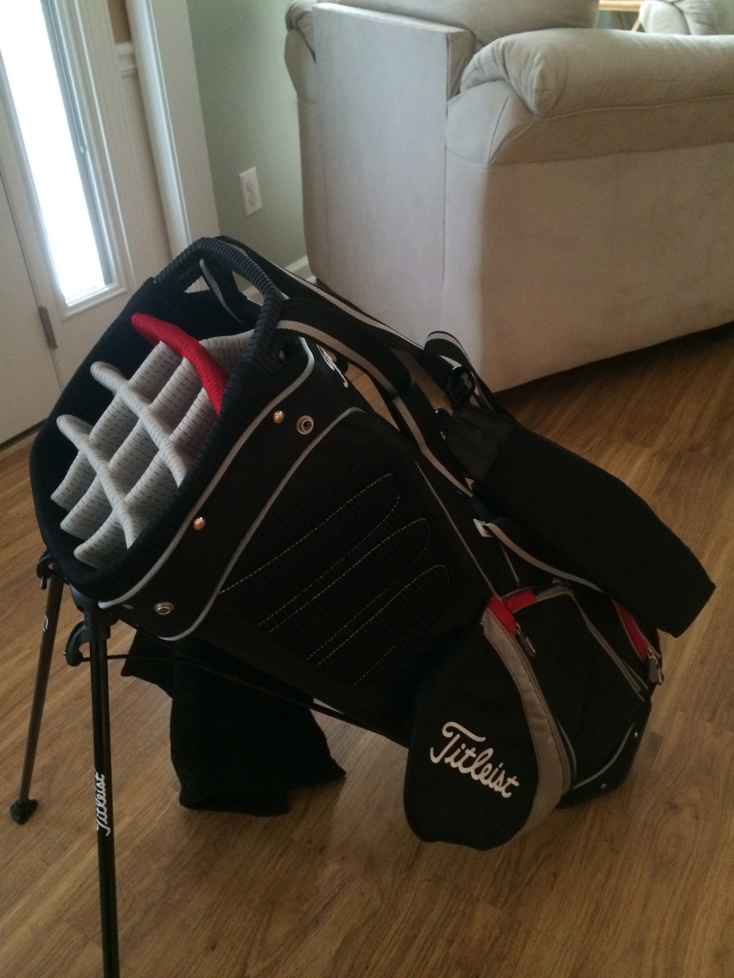 I have the 2013 14-way premium stand bag. A fantastic bag, but I'm hoping to not get it completely soaked on Saturday. I have an old rain hood from another bag, which I'll try and make fit or take my Titleist double canopy umbrella and stick it in one of the slots to cover the bag and leave a club at home. Chances are I'm not going to need the 3 iron much.