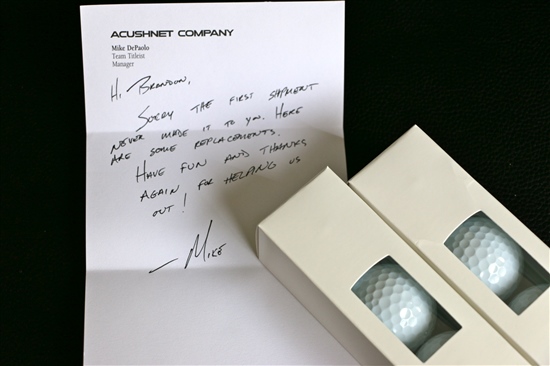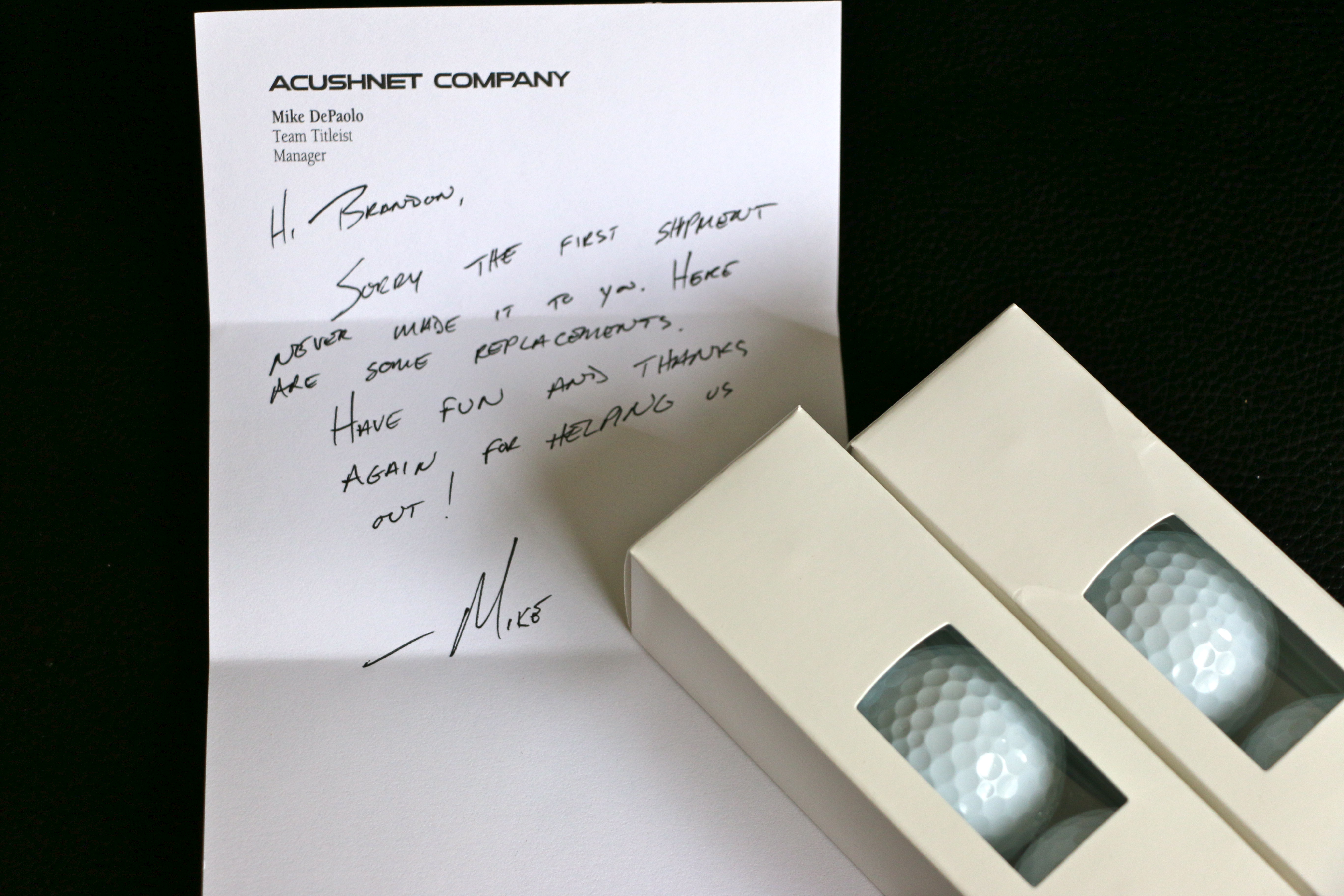 Today the door bell rang and knowing I had not spent my last paycheck on buying things online, I wasn't sure who it was. I opened the door and only a small box was left. As I began to open the box I realized it was from Titleist with a hand written note inside. Well as you can see, the image below speaks for itself.