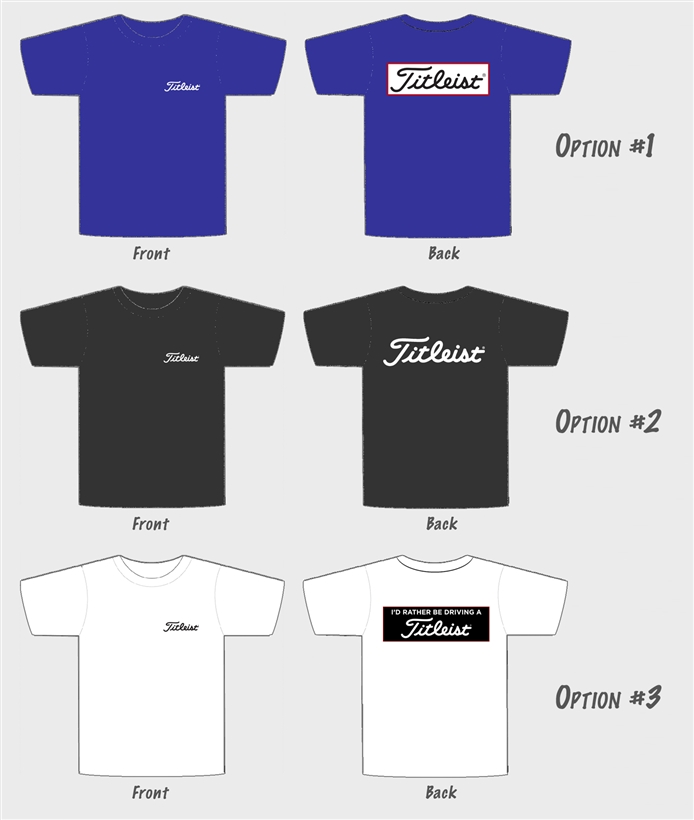 Great mock ups. I prefer the top shirt #1 as it reminds me the most of really be able to recognize the brand. When I was younger I always thought the box around Titleist was really cool as that is what I would see the Tour players have on their shirt sleeves. It has stuck with me ever since. One suggestion would be to take the Option #2 shirt and add the "boxed Titleist" logo on the sleeve, a casual appeal for a T-shirt, but resembles a tour shirt. Anyway, just a suggestion. All the T's look great, and I know I would be proud to wear one!